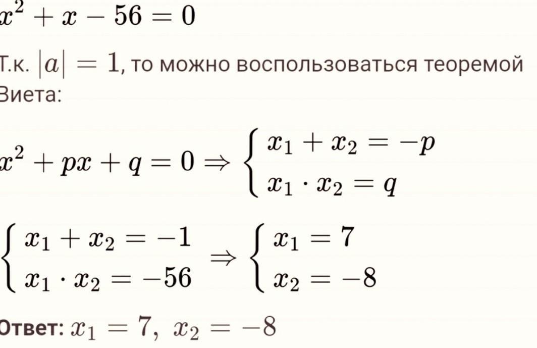 Cпособ 1. Воспользуемся теоремой Виета. Данное уравнение является приведенным, т.к. a равно 1. Уравнение в таком случае имеет вид: