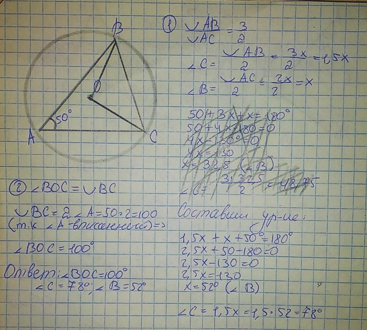 1)дуга BC=100°,значит угол BOC=100°,т.к это центральный угол, опирающийся на дугу в 100°