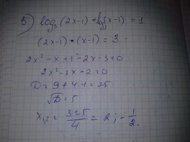 Вариант 5Решите уравнения. 1).log 3 (3x-5) = log 3 (x-3). 2).log 2 (4-3x) = 4 .3).log 22 (x+5) + log 22 (2x+3) = 1 .4).log 2 (2x-1) + log 2 5x = 1 5).log 3 (2x-1) +(х-1) = 1 6).log 0,2 (х²+4х) = -1.7.log (х-2)4 = 8.