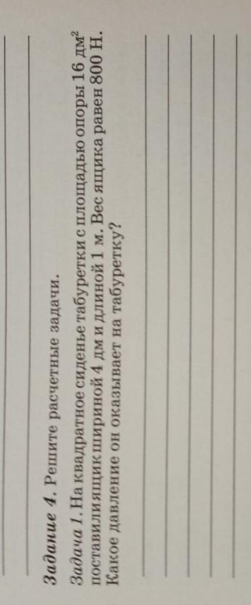 Пусть a - длина стороны сиденья. Так как по условию площадь сиденья S=a²=16 дм²=0,16 м², то a=√16=4 дм. Так как ширина ящика равна 4 дм, а длина равна 1 м=10 дм > 4 дм, то часть дна ящика будет полностью закрывать сиденье. Поэтому искомое давление P=F/S, где F=800 Н - вес ящика. Отсюда P=800/0,16=5000 Па = 5 кПа.