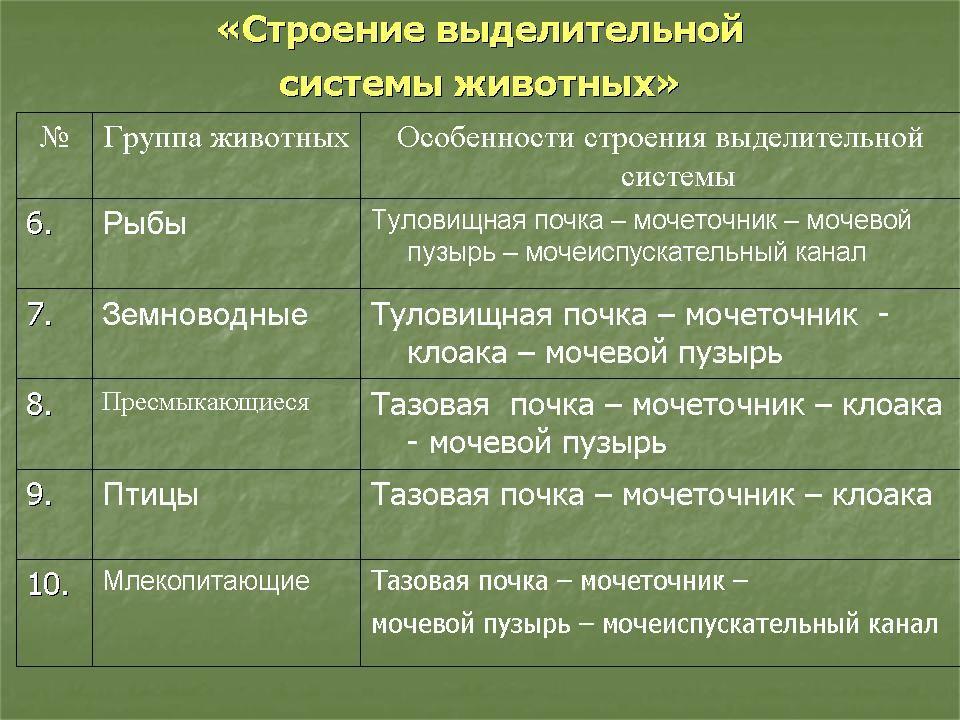 оставить сравнительную характеристику- таблицу "Выделительная система" для классов: млекопитающие, птицы, пресмыкающиеся, земноводные, рыбы, млекопитающие. Плизз