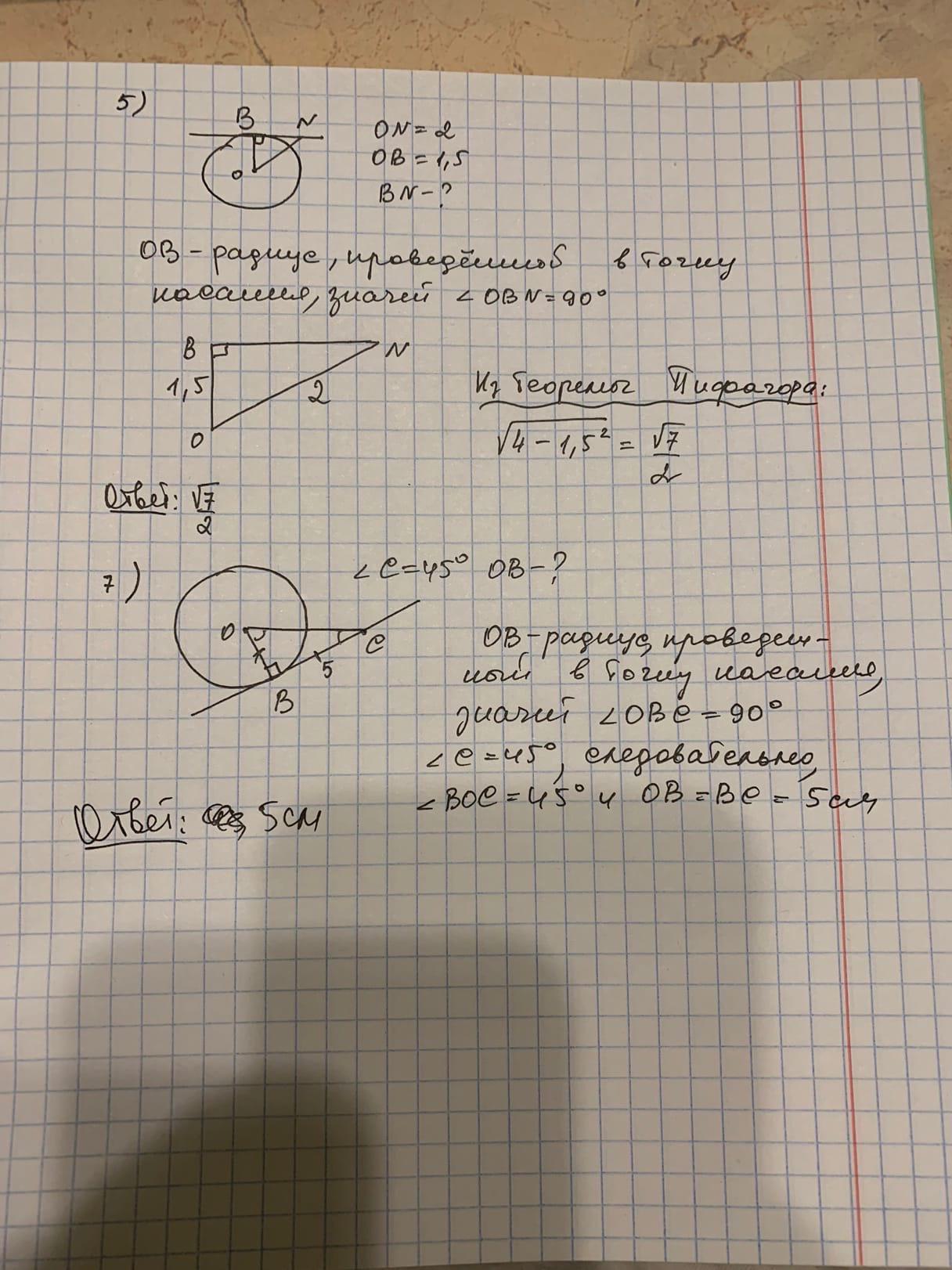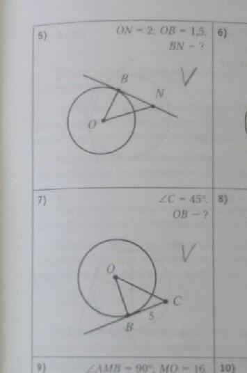 радиус ОА, проведённый к точке касания В образует с ней прямой угол 90°. Поэтому ∆ОВN-прямоугольный. По условиям ОВ=1,5см, а ON=2см. По теореме Пифагора найдём BN: