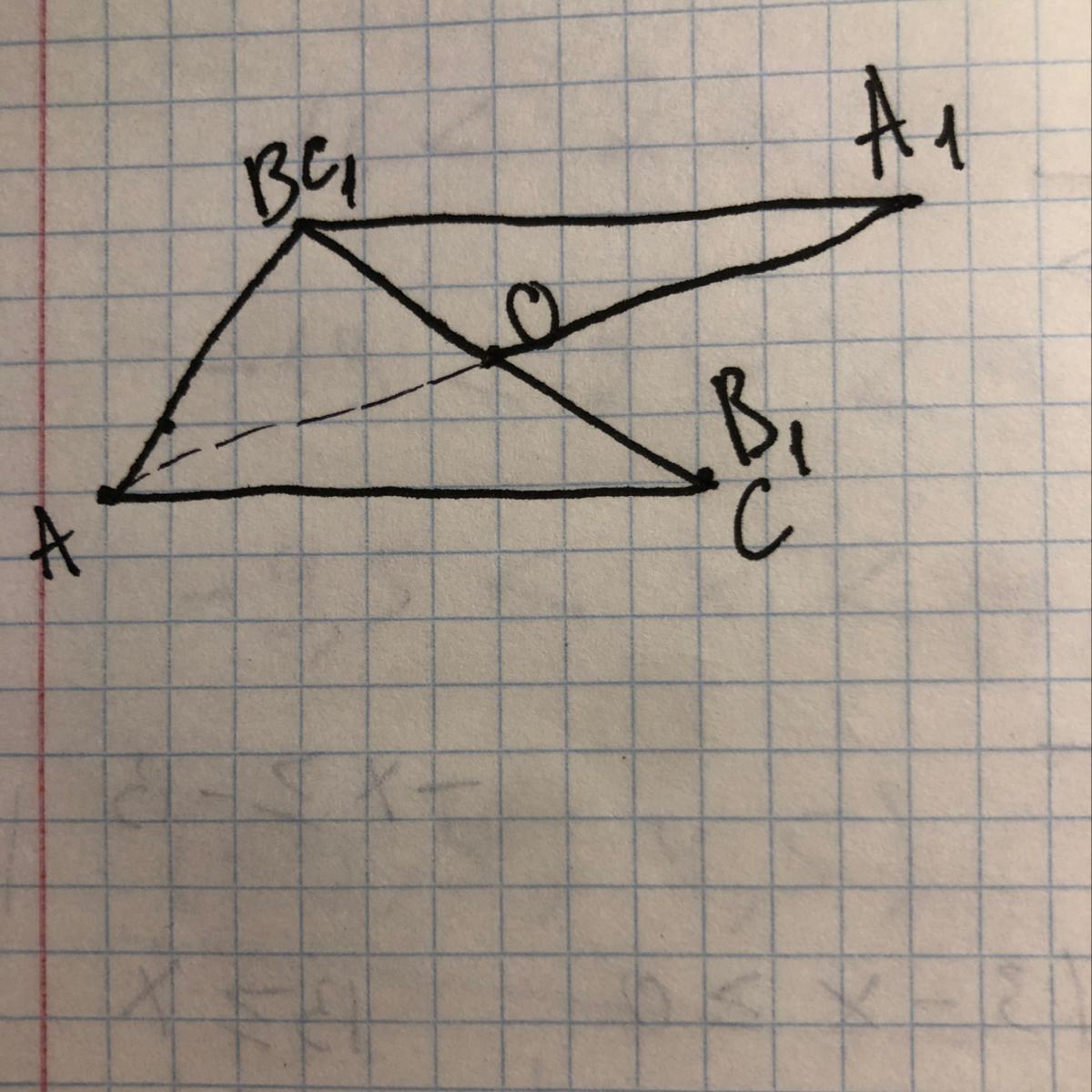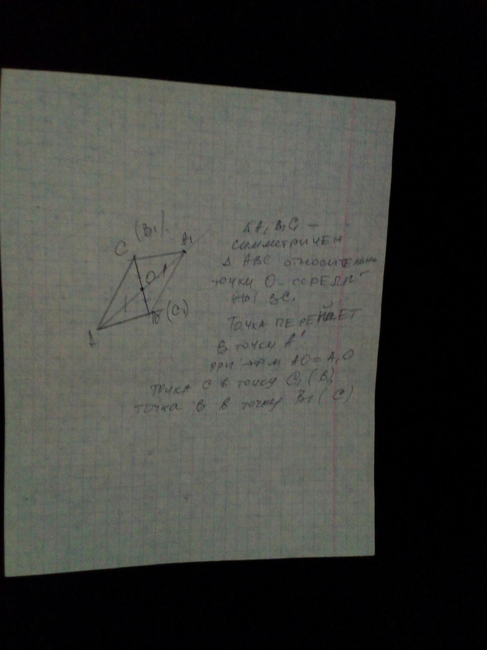 Побудуйте трикутникА1В1С1 симетричний різносторонньому трикутнику АВС відносно точки О, яка є серединою сторони ВС.