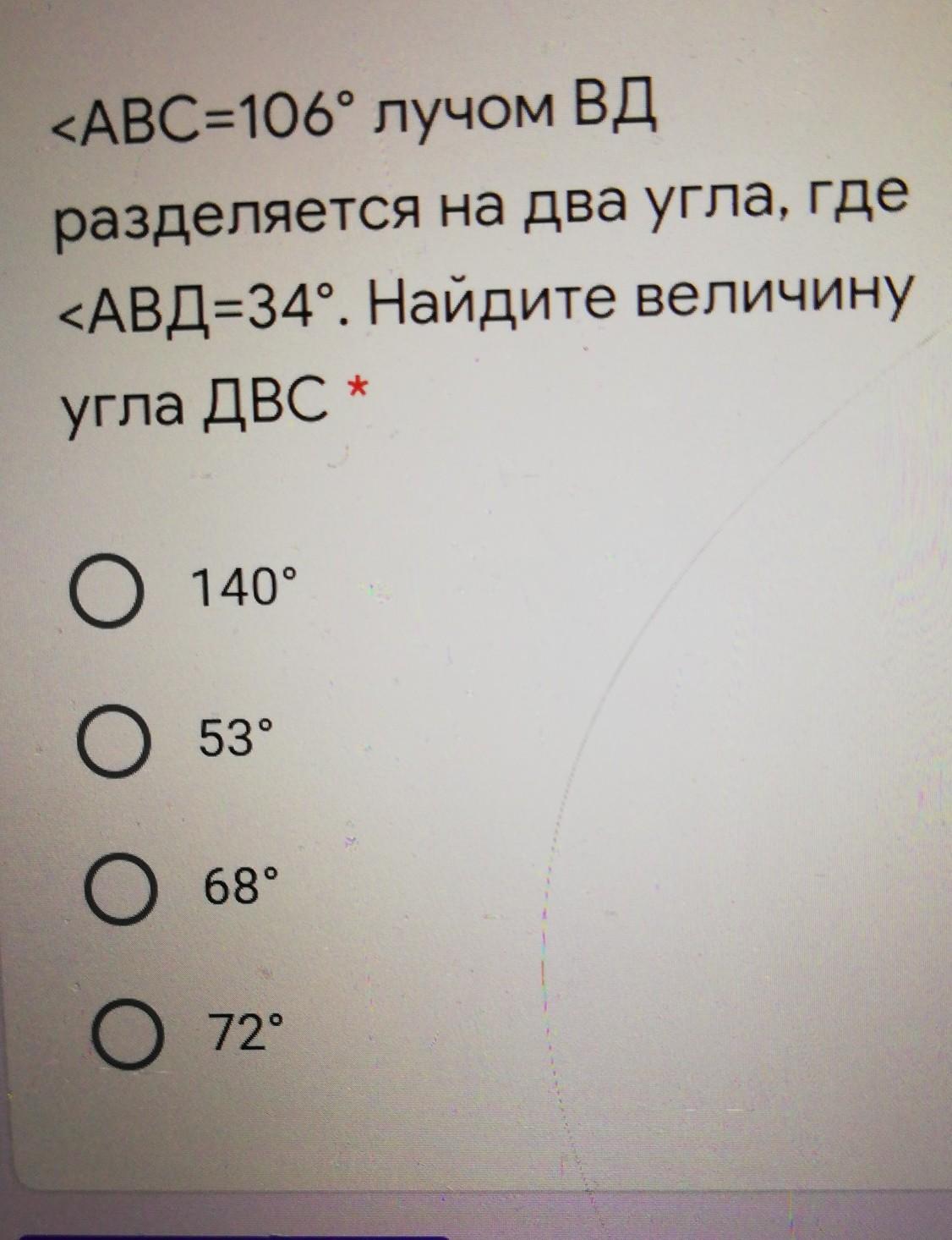 Всё очень просто - один угол 106 градусов делят на два угла, один из которых равен 34 градуса. Тогда второй угол равен (106 - 34) = 72 градуса.