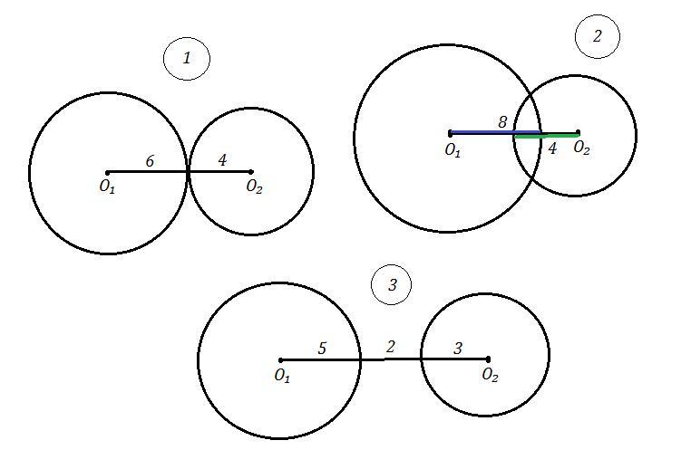 1) r₁=6см , r₂=4 см ⇒ окружности касаются друг друга внешним образом в одной точке,