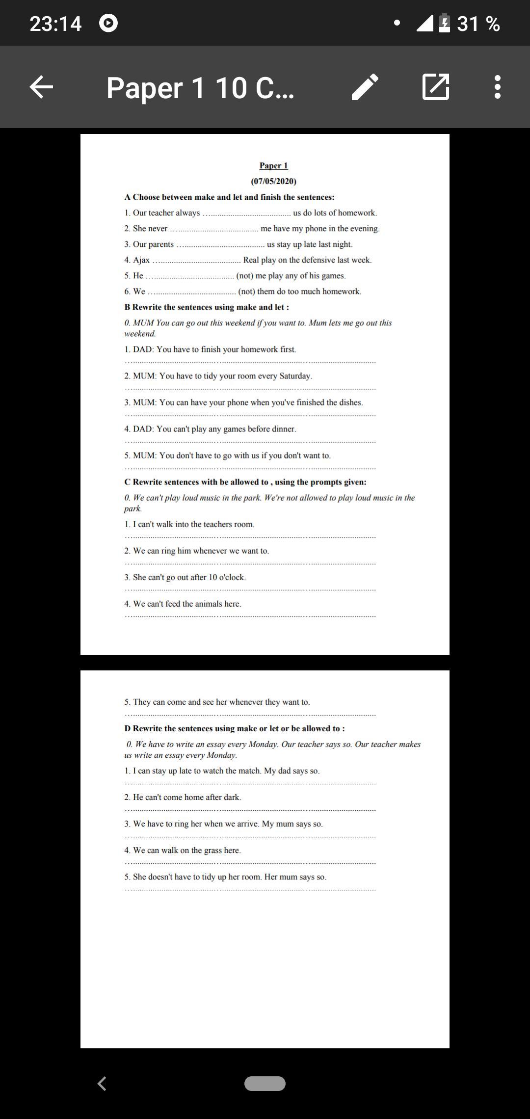 B.1.Dad makes me to finish my homework first. 2.Mum makes me to tidy my room every Saturday. 3.Mum lets me have my phone when I'm done with dishes. 4. Dad doesn't let me to play any games before dinner.5.Mum doesn't make me go out with them if I don't want to.