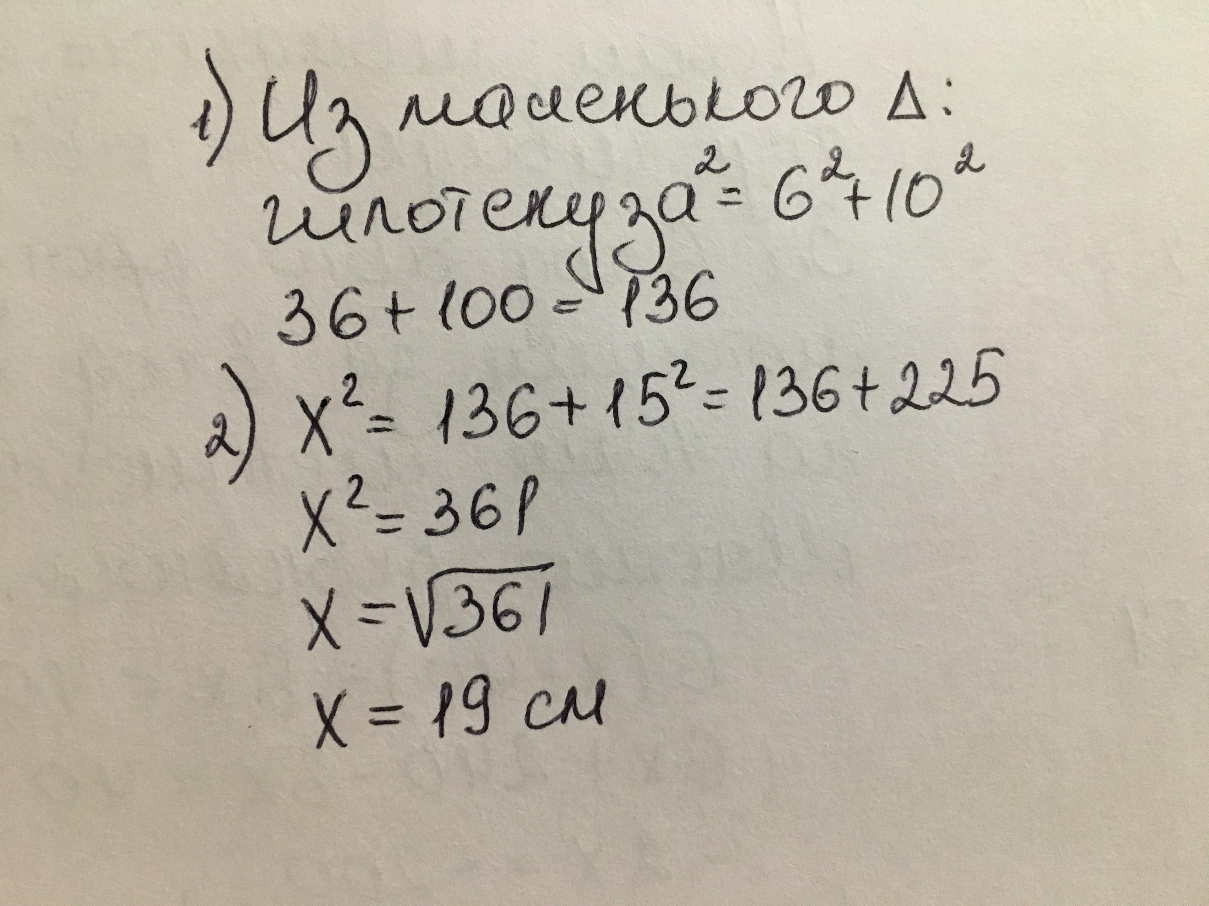 х=√(136+15²)=√361=19.