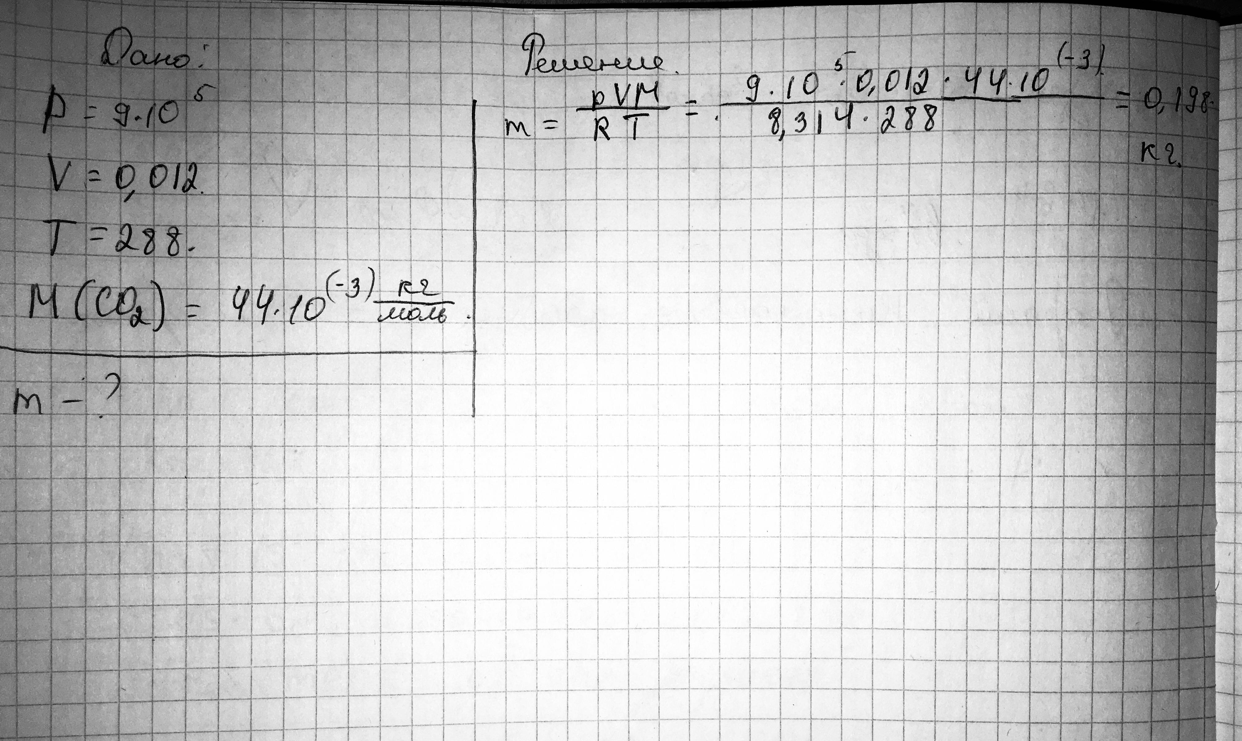 Имеется 12 л углекислого газа под давлением 9 ∙ 10^5 Па и при температуре 288 К. Определите массу газа..
