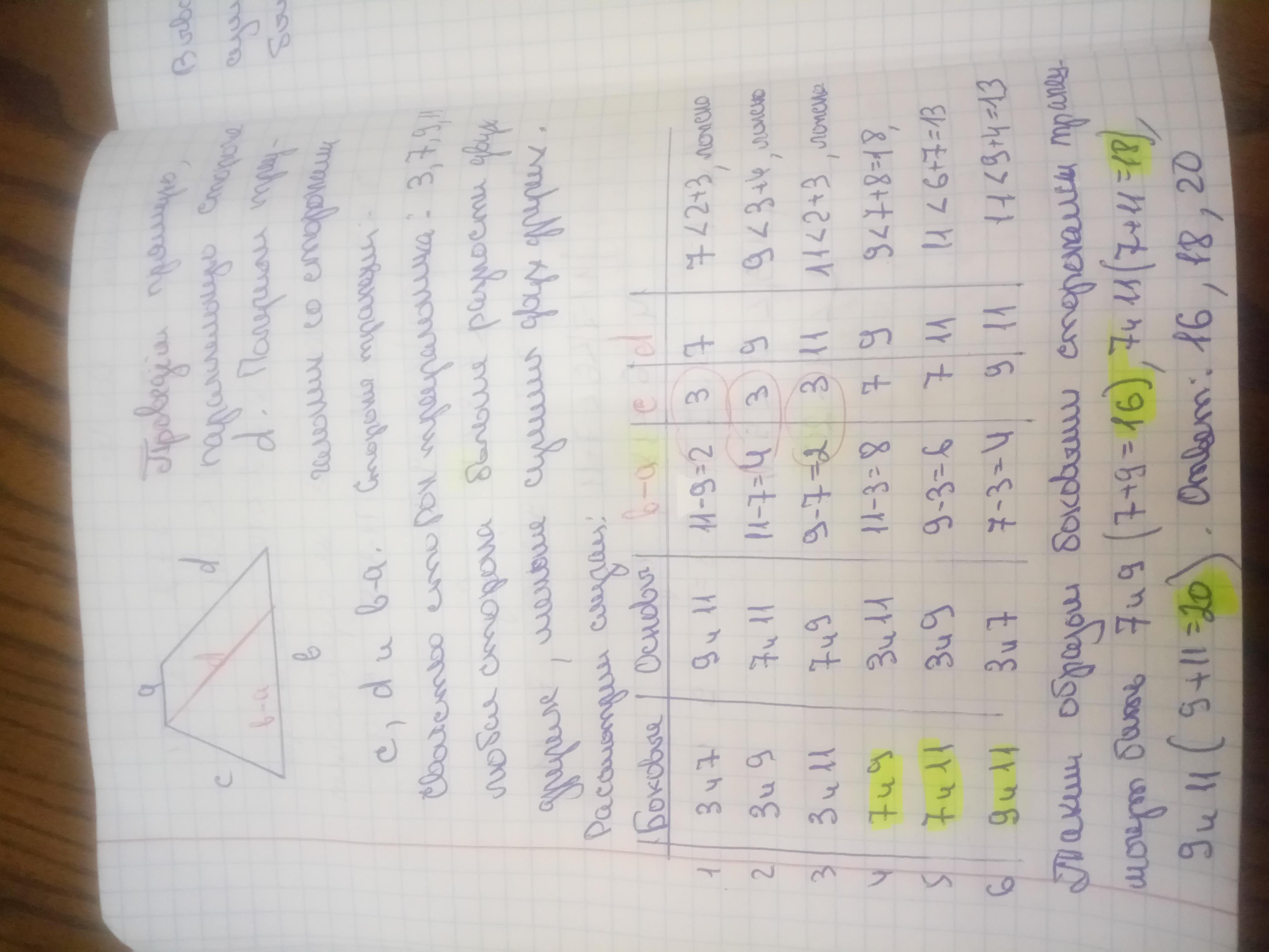 Длины сторон трапеции в каком-то порядке равны 3, 7, 9 и 11. Чему может быть равна сумма длин боковых сторон этой трапеции?