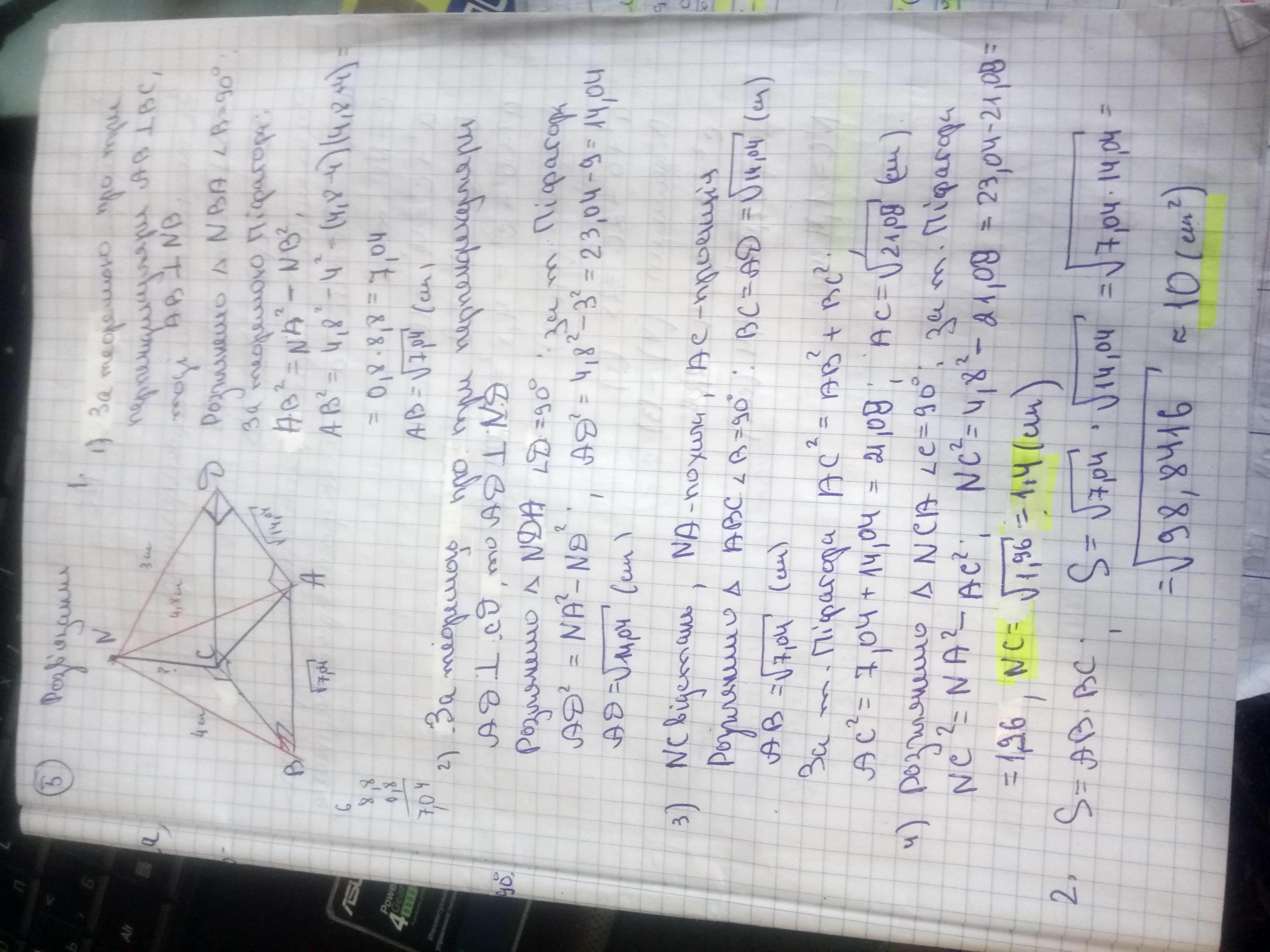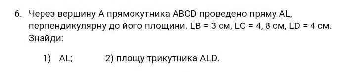 через вершину А прямоугольника ABCD проведено пряму AL перпендикулярну жо його площини. LB=3 см, LC= 4,8см, LD=4 см. знайдіть 1)AL 2)площу трикутника ALD