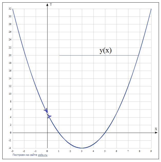 В точке х=0 функция у(х) не существует, так как х, находясь в знаменателе, позволяет взять предел данной функции. Предел этой функции в точке х=0 равен значению f (x). То есть f (0)=(0-1)*(0-5),