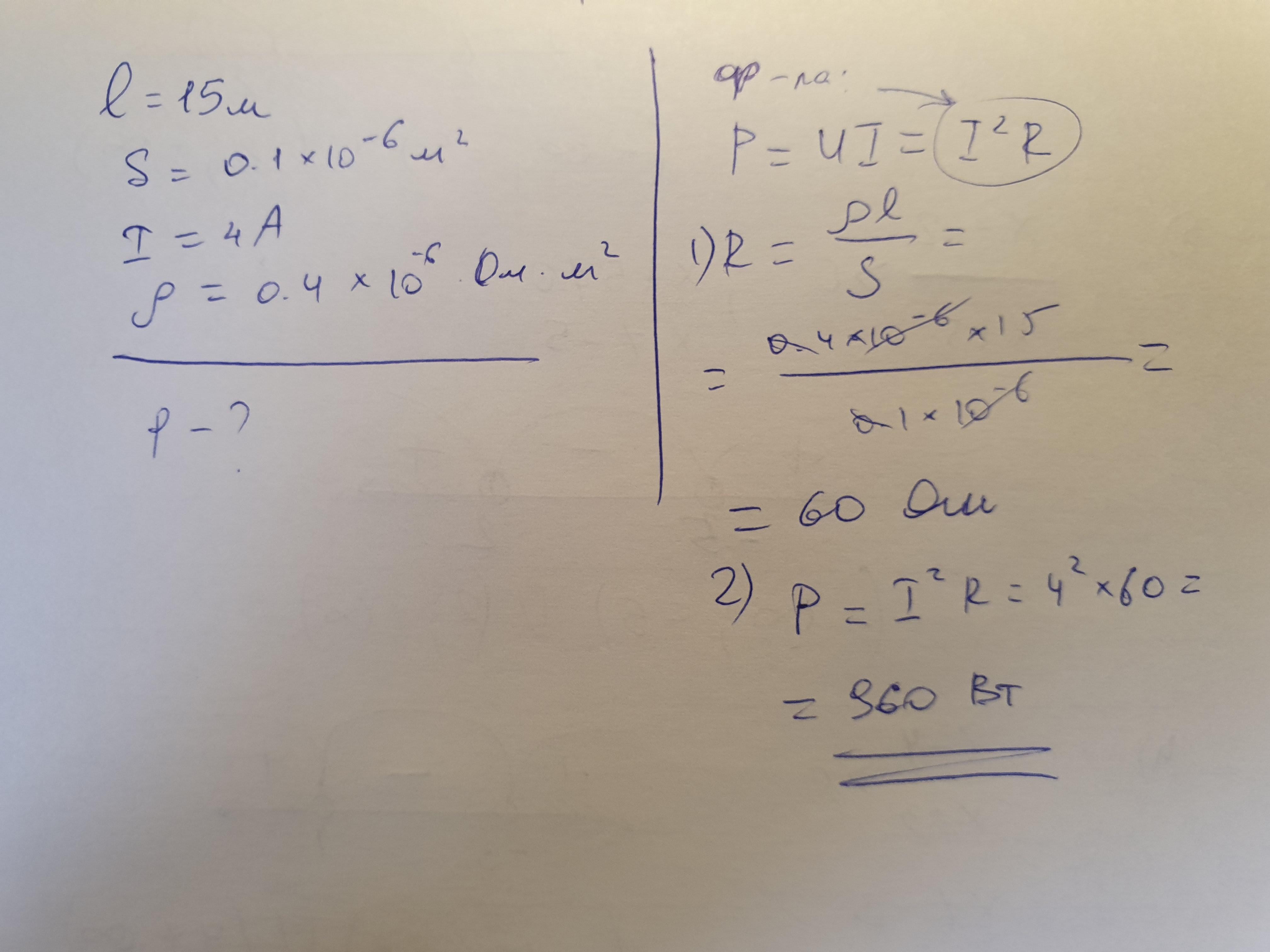 Спираль электроплитки изготовлена из никелиновой проволоки длиной 15 м и площадью сечения 0,1 мм^2 сила тока протекающего по спирали, 4 а. Определите мощность электроплитки. Удельное сопротивление никелина 0,4 Ом * мм2/м
