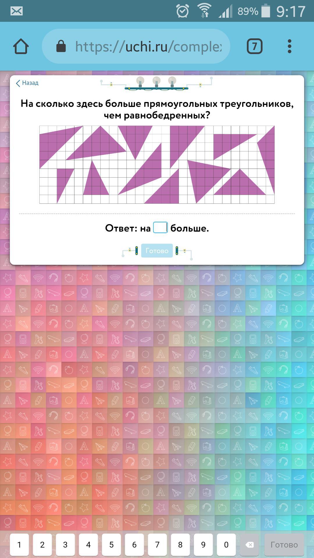 Всего 5 прямоугольных треугольников (треугольник, в котором хотя бы 1 угол прямой) и 3 равнобедренных треугольника (треугольник, в котором 2 стороны равны).