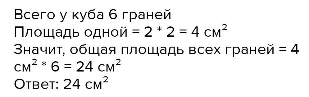 Всего граней в кубе:6 ; у одной стороны площадь 4; 4*6=24