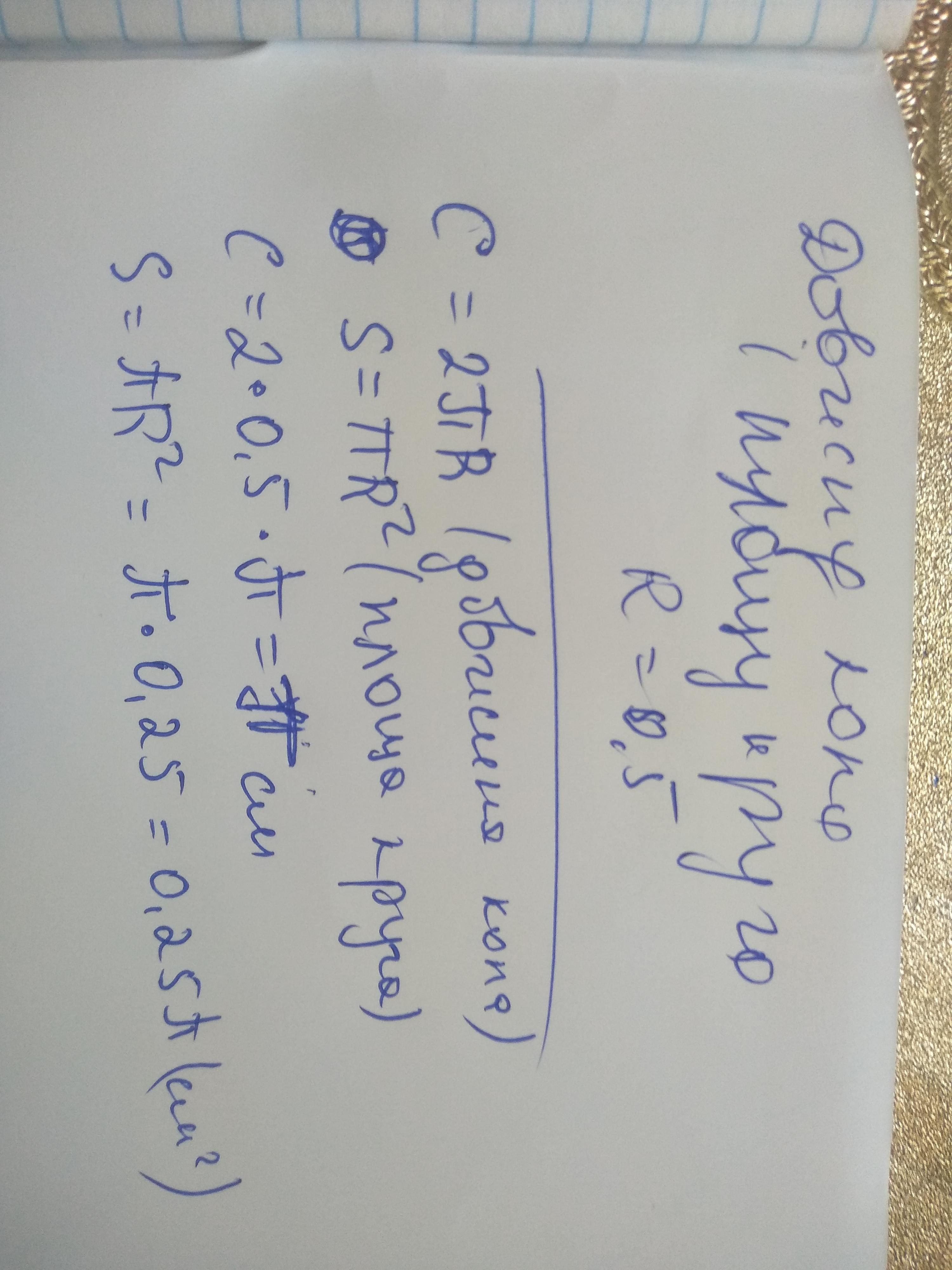 Обчислити довжину кола і площу круга радіуса 0,5 (π=3,14)
