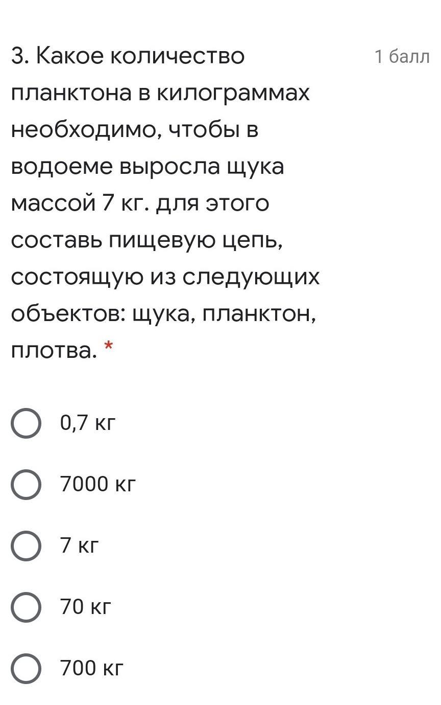 Какое количество планктона в килограммах необходимо, чтобы в водоеме выросла щука массой 7 кг. для этого составь пищевую цепь, состоящую из следующих объектов: щука, планктон, плотва.