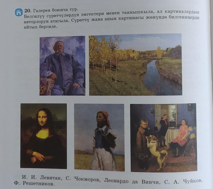 Ответ: 1)С. Чокморов 2) И.И. Левитан 3)Леонардо да Винчи 4)С.А. Чуйков 5)Ф. Решетников.