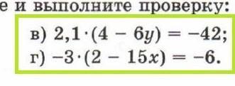 2.1*(4-6y)=-42\\8.4-12.6y=-42\\-12.6y=-42-8.4\\-12.6y=-50.4\\y=-50.4:(-12.6)\\y=4\\\\-3*(2-15x)=-6\\-6+45x=-6\\45x=-6+6\\45x=0\\x=0:45\\x=0