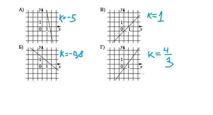 1. А, Б- отрицательные коэффициенты, их легко найти по Вашим подсказкам и проверить. А соответствует угловой коэффициент тангенс угла наклона прямой. он равен пяти, Б угловой коэффициент равен -4/5, или -0.8, для оставшихся двух прямых В соответствует угловому коэф. 1, и Г угловому коэффициенту 4/3