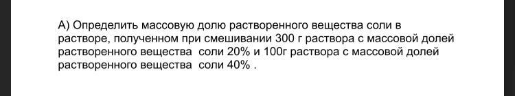 А) Определить массовую долю растворенного вещества соли в растворе, полученном при смешивании 300 г раствора с массовой долей растворенного вещества соли 20% и 100г раствора с массовой долей растворенного вещества соли 40% .