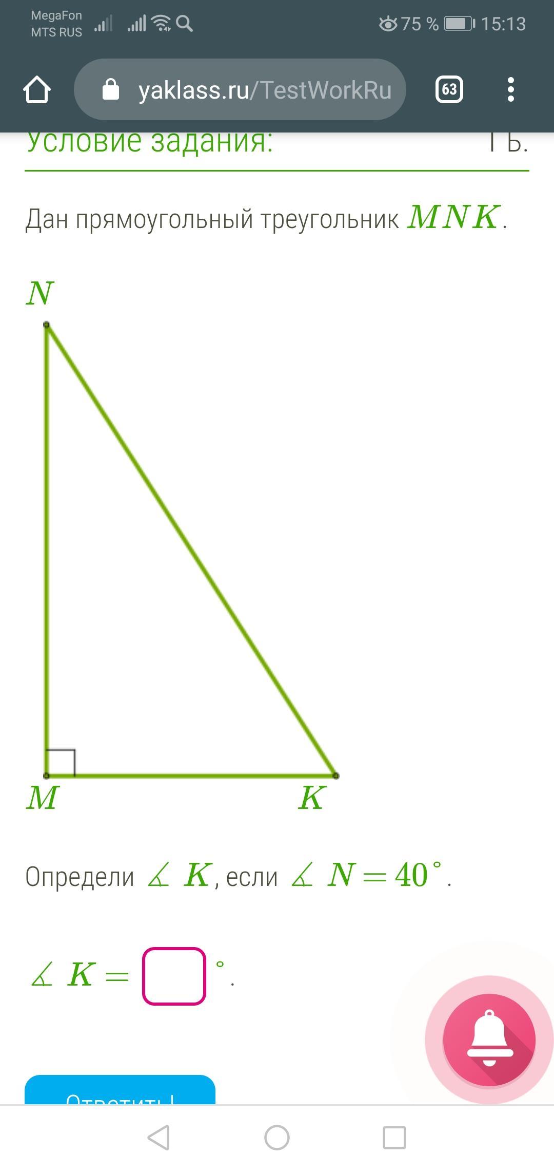 Поскольку сумма острых углов прямоугольного треугольника 90° то <К=90-<N=90-40=50°
