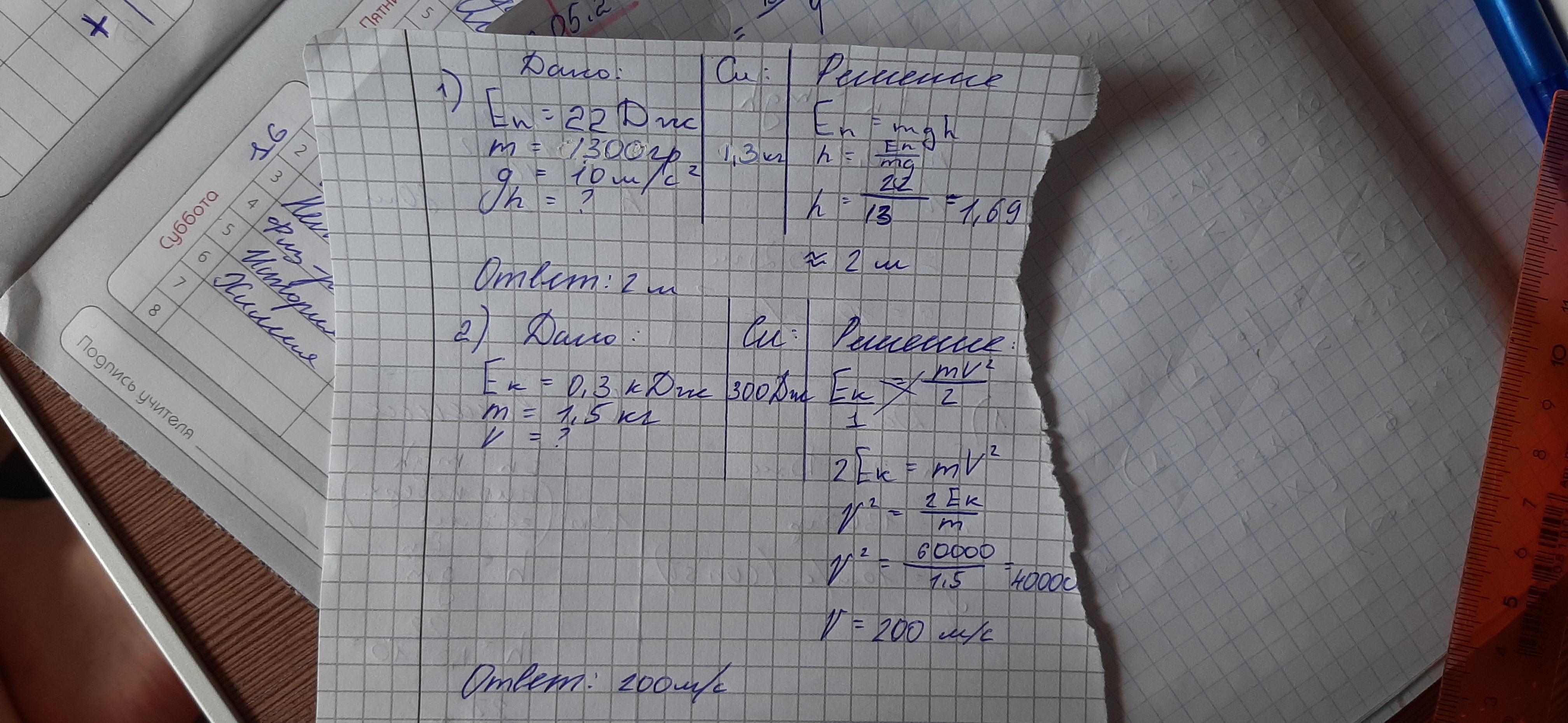 2) Кинетическая энергия пушечного ядра, сразу после выстрела равна 0,3 кДж. Определите его скорость, если масса равна 1,5 кг.