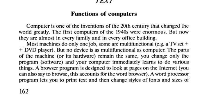 Функции компьютеров Компьютер - одно из изобретений 20-го века, которое сильно изменило мир. Первые компьютеры 1940-х годов были огромными. Но сейчас они есть почти в каждой семье и в каждом офисном здании. Большинство машин выполняют только одну работу, некоторые многофункциональны (например, телевизор + + DVD-плеер). Но нет такого многофункционального устройства, как компьютер. Части машины (или ее аппаратное обеспечение) остаются неизменными, вы меняете только программу (программное обеспечение), и ваш компьютер сразу же учится делать разные вещи. Браузерная программа предназначена для просмотра страниц в Интернете (вы также можете сказать, чтобы просматривать, это объясняет слово браузер). Программа текстового процессора позволяет печатать текст, а затем изменять стили шрифтов и размеры