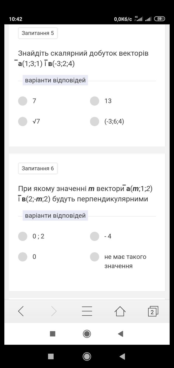 6. векторы перпендикулярны. если их скалярное произведение равно нулю. т.е. 2m-m+4=0, откуда m=-4
