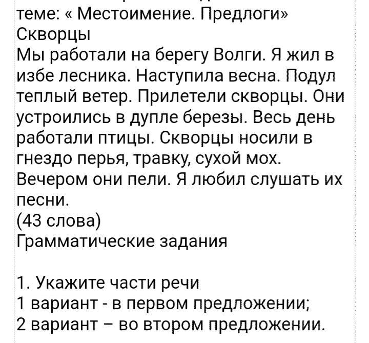 Мы работали на берегу Волги.Я жил в избе лесника.Наступила весна.Подул теплый ветер.прилетели скворцы.Они устроились в дубле березы.Весь день работали птицы.Скворцы носили в гнездо перья ,травку ,сухой мох.Вечером они пели.Я любил слушать их песни. Грамматические задание.укажите части речи