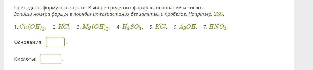 2)HCl; 4)H2SO3; 7)HNO3 в порядке возрастания пишете 2,4,7. А 5) KCl это соль и потому ни в какой из этих двух пунктов не входит. Будут вопросы спрашивайте
