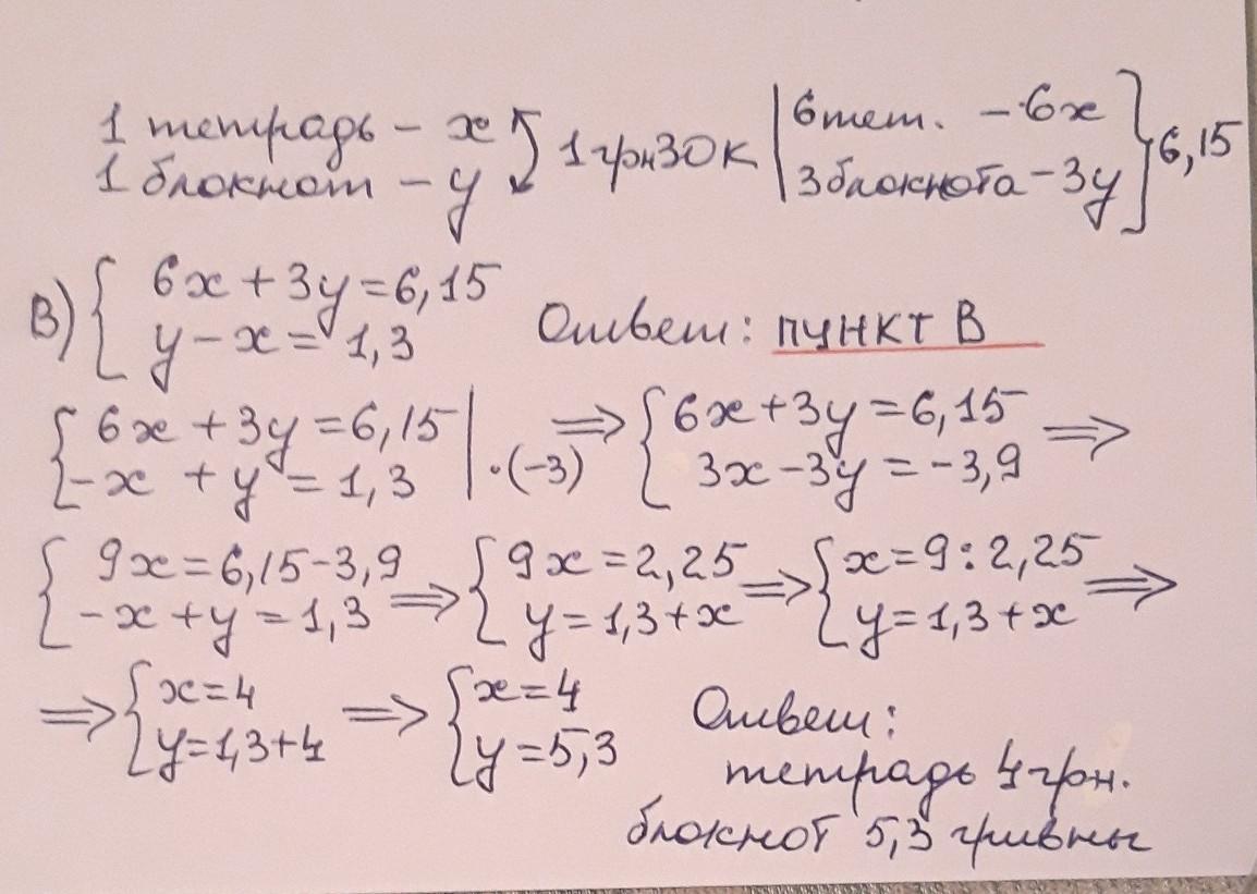За шість зошитів і три записники Сашко заплатив 6 грн 15 к. Зошит дешевший від записника на 1 грн 30 к. Яка система рівнянь відповідає цій умові , якщо прийняти, що один зошит коштує х грн а один записник - у грн?