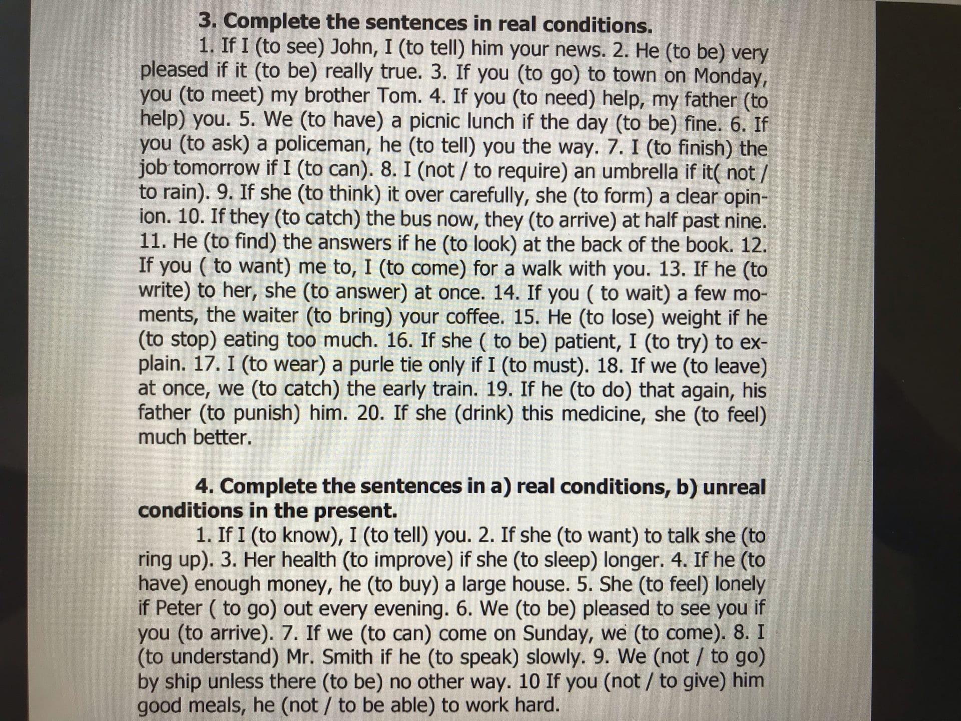 4. 1) If l knew, I would tell you. 2) If she wanted to talk, she would ring up. 3) Her health would improve, if she slept longer. 4) if he had enough money, he would buy a large house. 5) She would feel lonely if Peter went out every evening. 6) We would be pleased to see you if you arrived. 7) If we could come on Sunday, we would come. 8) I would understand Mr. Smith if he spoke slowly. 9) We wouldn`t go by ship unless there was on other way. 10) If you gave him good meals, he wouldn`t be able to work hard.