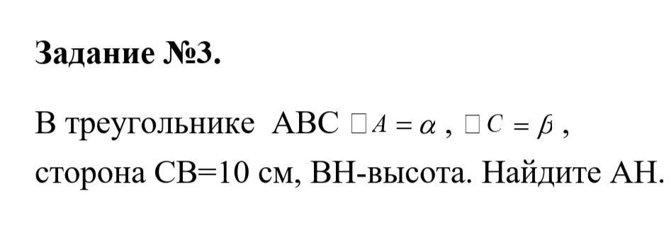 В треугольнике АВС , ∠А=α, С=β, сторона СВ=10 см, ВН-высота. Найдите АН.