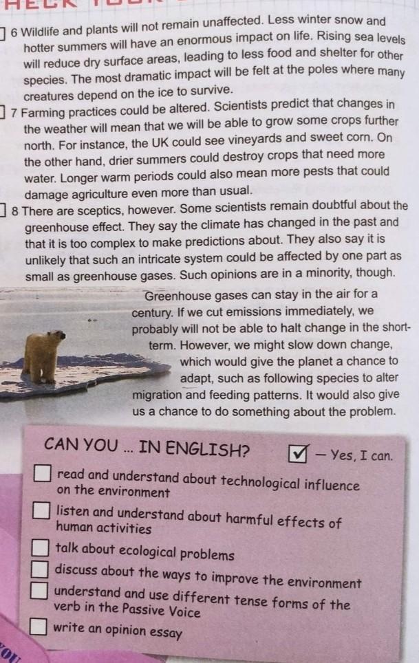 8. Однако есть и скептики. Некоторые учёные по прежнему сомневаются в том, что это - парниковый эффект. Также они говорят,что климат изменялся и в прошлом, и что делать такие прогнозы это слишком сложно. Они считают что это маловероятно,что такая сложная система не может быть затронута такой небольшой частью, как парниковые газы. Однако такие мнения находятся в меньшинстве. Парниковые газы могут оставаться в атмосфере в течении долгого времени - веками. Если мы немедленно сократим выбросы, то вероятно сможем остановить эти изменения в кротчайший срок. Мы могли бы замедлить изменения, чтобы дань планете шанс,например адаптироваться следующим видам, изменить модели миграции и кормления. Это бы тоже дало нам шанс что-то сделать с этой проблемой.