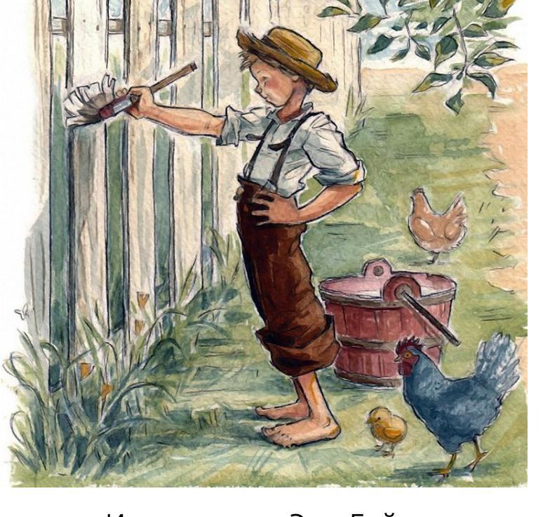 На данной иллюстрации мы можем видеть мальчика предположительна Тома Сойера который красит забор. Так же на картине мы можем видеть двух красочных кур и одного цыплёнка над головой парня мы можем заметит дерево. Сам мальчик одет в в белую рубашку и штаны.