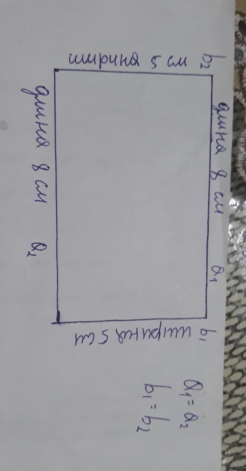 Нужно начертить прямоугольник, в котором две горизонтальные стороны = 8 см см каждая (16 клеток) и две вертикальные стороны, которые их соединяют = 5 см каждая (10 клеток)