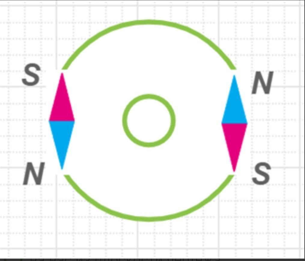 Укажи направление тока в проводнике, изображённом в центре рисунка.
