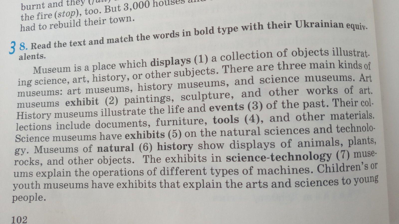 Музей - это место, где экспонируется (1) коллекция предметов, иллюстрирующих науку, искусство, историю или другие предметы. Существует три основных вида музеев: художественные музеи, исторические музеи и научные музеи. Художественные музеи выставляют (2) картины, скульптуру и другие произведения искусства. Исторические музеи иллюстрируют жизнь и события (3) прошлого. Их коллекции включают документы, мебель, инструменты (4) и другие материалы. Научные музеи имеют экспонаты (5) по естественным наукам и технике. Музеи естественной (6) истории показывают выставки животных, растений, камней и других объектов. Экспонаты в научно-технических музеях (7) объясняют работу различных типов машин. В детских или юношеских музеях есть экспонаты, которые объясняют людям искусство.