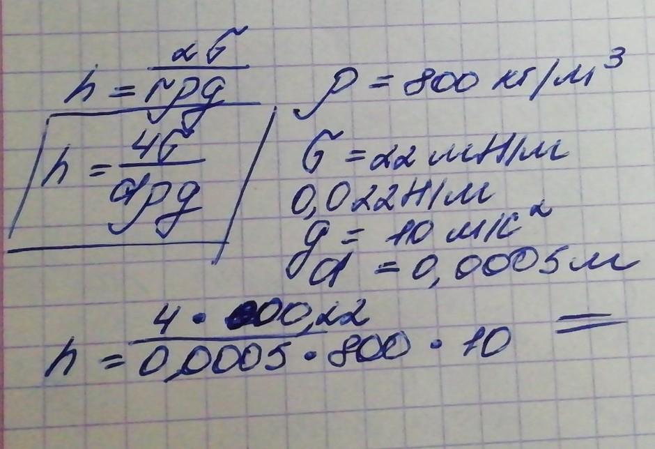 В спирт опущено капілярну трубку діаметром 0,5 мм. На яку висоту підніметься спирт в трубці, якщо коефіцієнт поверхневого натягу спирту – 22 мН/м, густина спирту – 800 кг/м3.