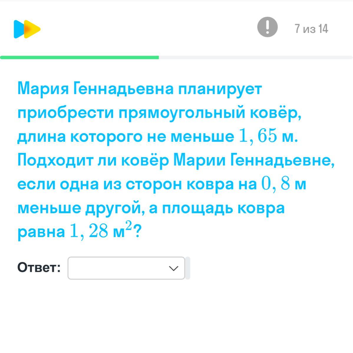 Мария Геннадьевна планирует приобрести прямоугольный ковёр, длина которого не меньше 1,65 м. Подходит ли ковёр Марии Геннадьевне...