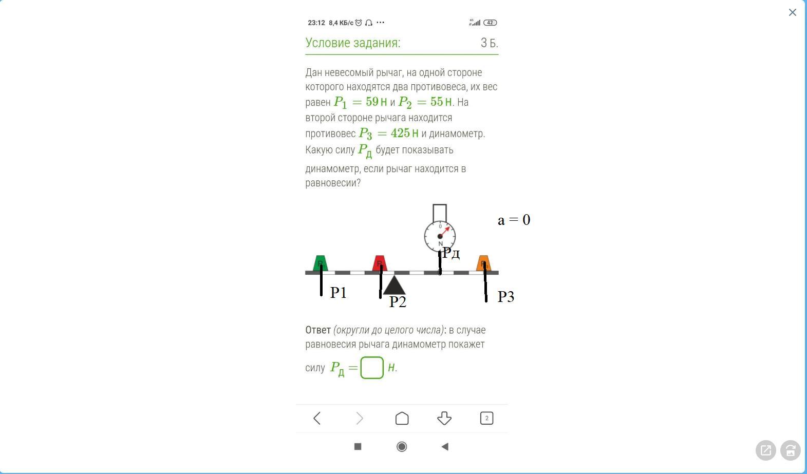 50 баллов Дан невесомый рычаг, на одной стороне которого находятся два противовеса, их вес равен P1=59Н и P2=55Н. На второй стороне рычага находится противовес P3=425Н и динамометр. Какую силу PД будет показывать динамометр, если рычаг находится в равновесии?