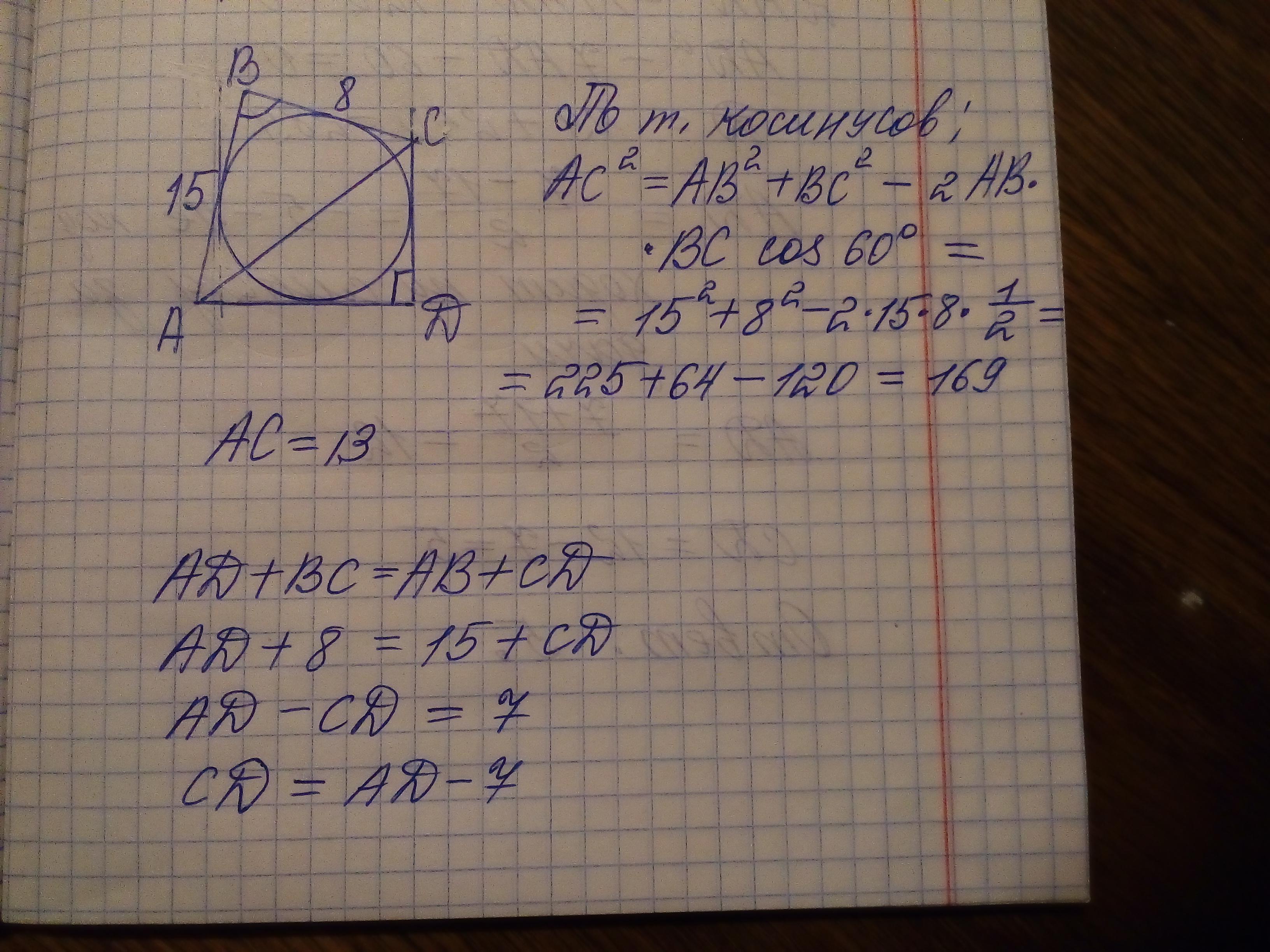 Около окружности описан четырехугольник один из углов равен 90° противолежащий угол ему равен 60° а стороны образующий угол 60° равны 8 и 15 найдите длинну меньшей стороны четырехугольника