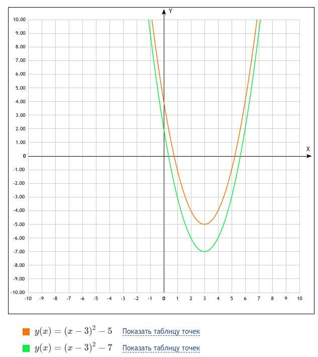 Строятся полностью оба куска (довольно легко, по факту из новой точки - в 1-ом куске (3;-5), во 2-м (3;-7) строим самые простые параболы , ну то есть мысленно представляем, что, например, точка (3;-5) является началом координат и от неё параболку шаблонную строим с заученной наизусть таблицей) и на каждом интервале остается только та часть, которая указана в системе.