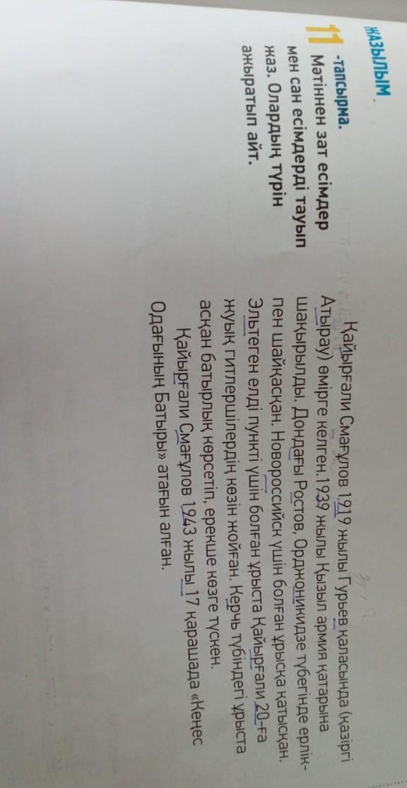 Зат есімдер: "Қайырғали Смағұлов, Гурьев, Атырау, Дондағы Ростов, Орджоникидзе, Новороссийск, Эльтеген, Қайырғали, гитлершілер, Керчь, Батыр."