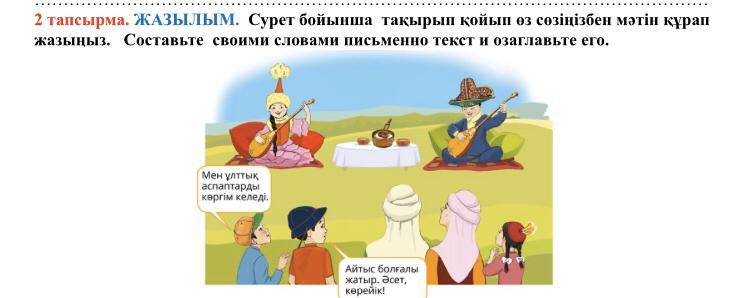 Айтыс өнері қазақ халқында өте маңызды орын алады. Бұл жерде екі адам бір-бірімен айтысады. Айтысатын адамдарды айтыскер деп атайды. Олар домбырамен айтысады. Бұл жерде ұлттық аспапты көргісі келетін бала көрсетілген. Ол баланың есімі Әсет болады. Қасындағы ағасы оған айтыс болғалы жатқанын жеткізді. Олар бұл жерге анасы мен әжесімен келіпті. Сонымен қатар олардың кішкентай қарындасы бар. Олардың айтысқа қызығушылығы артып тұр. Тамашалап, бақылап тұр. Айтысқа ер адам мен қыз бала қатысып жатыр. Екеуіде өте әдемі киінген. Қазағымыздың ұлттық киімдерін киюмен қатар, ұлттық аспабымызда ойнап отыр. Олардың отырған дастарқан үстінен қымызды көруге болады. Қымыз біздің ұлттық сусынымыз. Айтыс кең, жазық далада өтіп жатыр. Бұл қазағымыздың кең даласы, неткен керемет десеңші. Айтыс өнері салт-дәстүрімізбен байланысты. Айтыскер ақын сонымен қатар суырыпсалма қасиетке ие болуы шарт. Олар негізгі мәселені талқылап, немесе бір-бірімен қағытпа қалың арқылы айтысуы мүмкін. Бір сөзбен айтқанда, қазағымыздың бұл өнеріне ештеңе жетпейтіні рас.