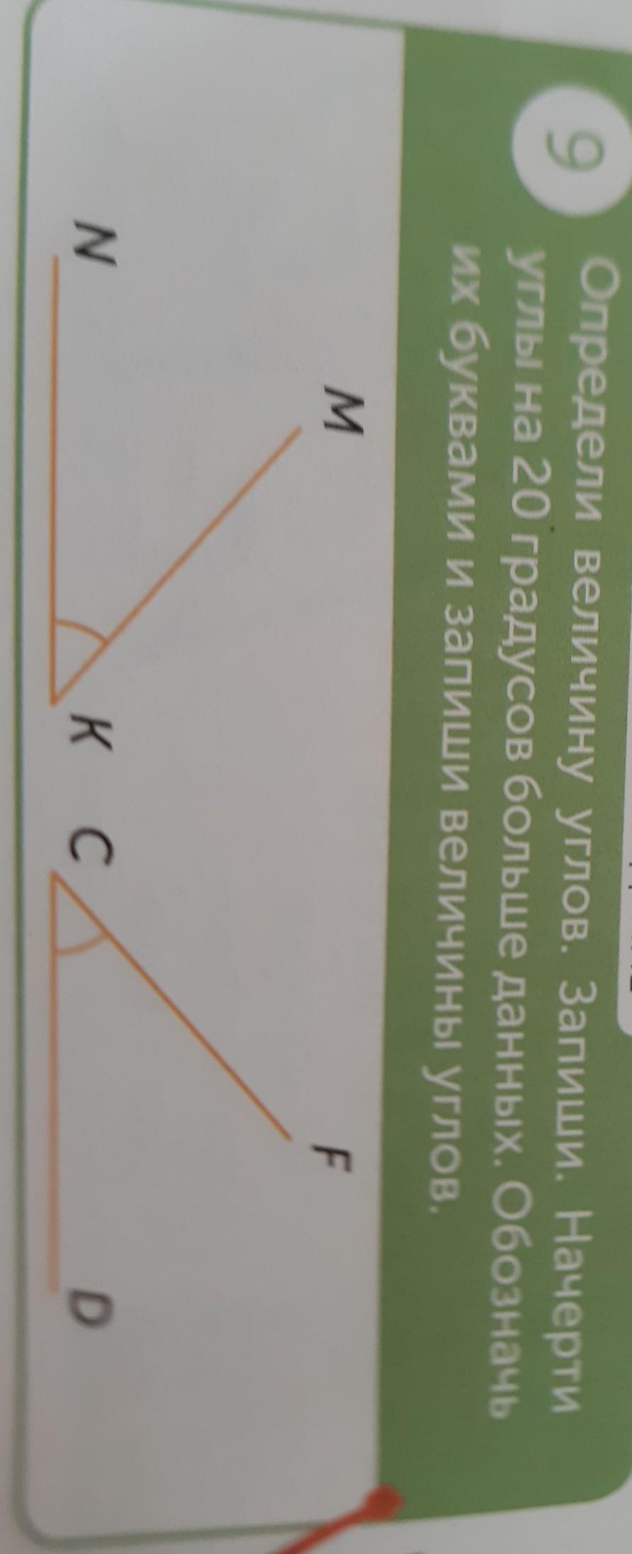 привет. к сожалению, у меня нет транспортира,но могу помочь с решением. там где буква к (само соединение угла) ты кладешь транспортир и с левой стороны ты увидишь, где будет находится оранжевая полоска с сверху. так ты узнаешь градус угла. со следующим так же