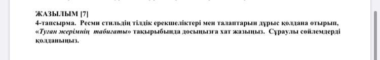 Сәлем досым осы хатында саған туған жерімнің табиғаты туралы айтқым келеді. Қазақстанда көрікті жерлер көп Бурабай, Арал өзені, Балхаш және т.б жерлер көп. Мен саған Бурабай туралы айтып берейін.