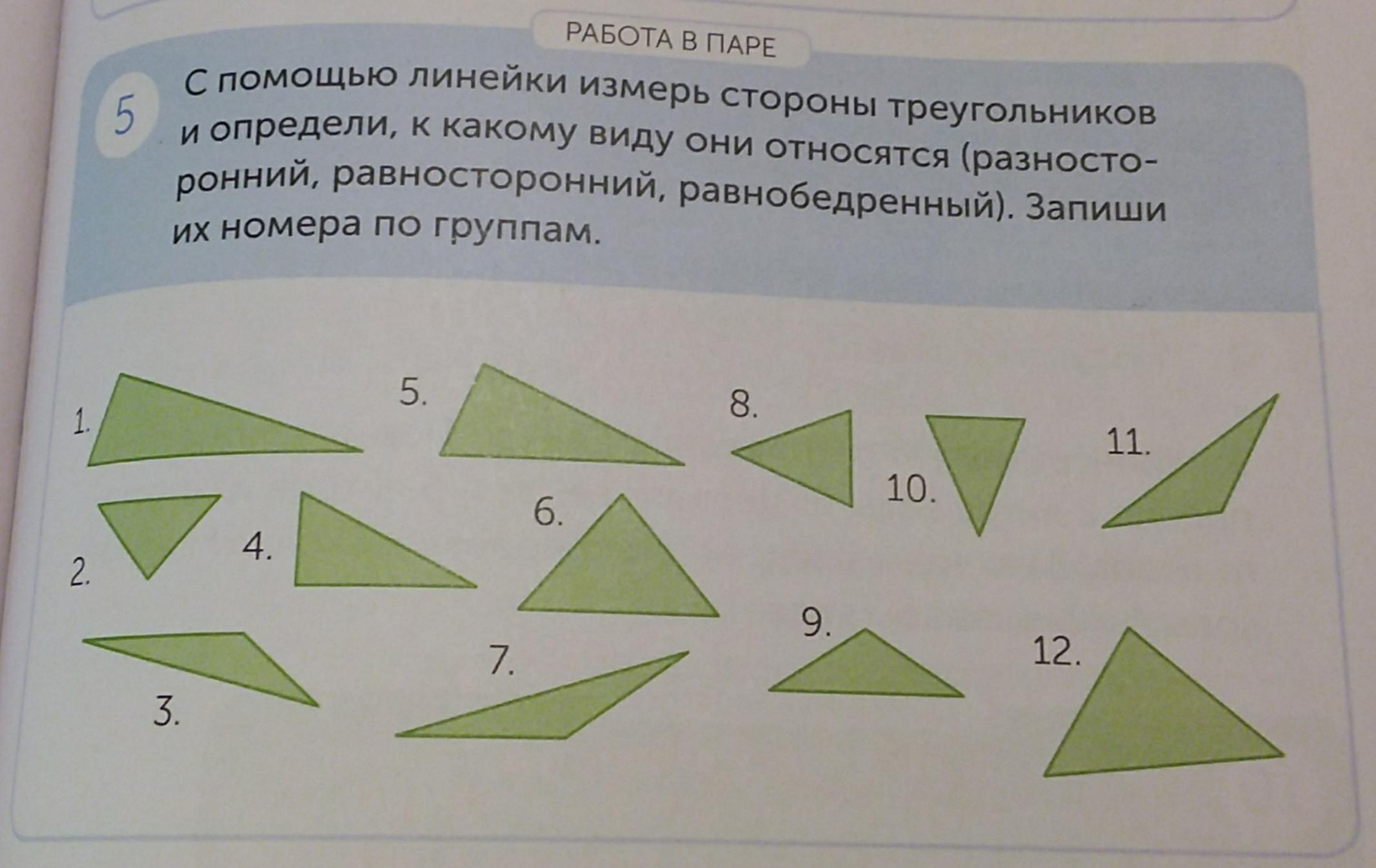 по рисунку могу сказать что разносторонние 1, 3, 4, 5, 8, 11, 12; равносторонние 2, 6, 9, 10; равнобедренные: 1, 7.
