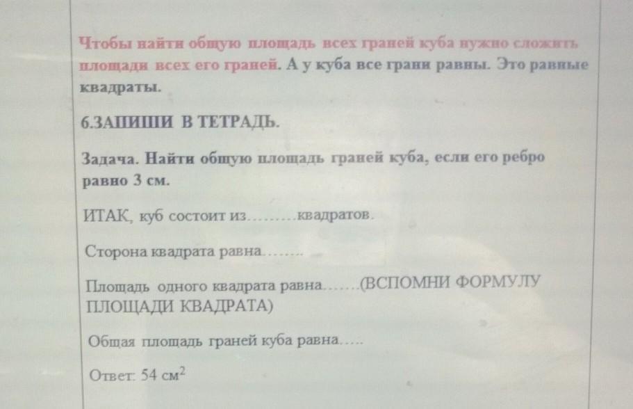 Общая площадь граней куба равна 9•6 = 54 кв.см (в кубе шесть квадратных граней)