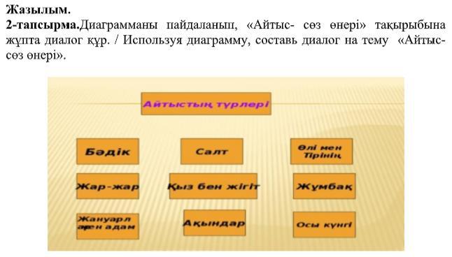 -Олар: Ба́дік, Салт, Акындар айтысы, Жу́мбак айтыс, Жар-жар жа́не таґы да баскалары (т.б)